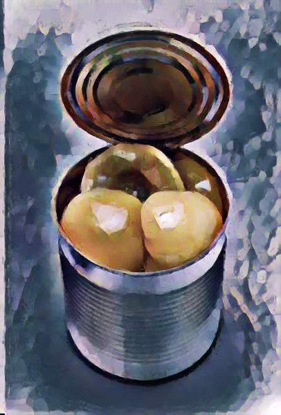 sits a lowly tin of peaches